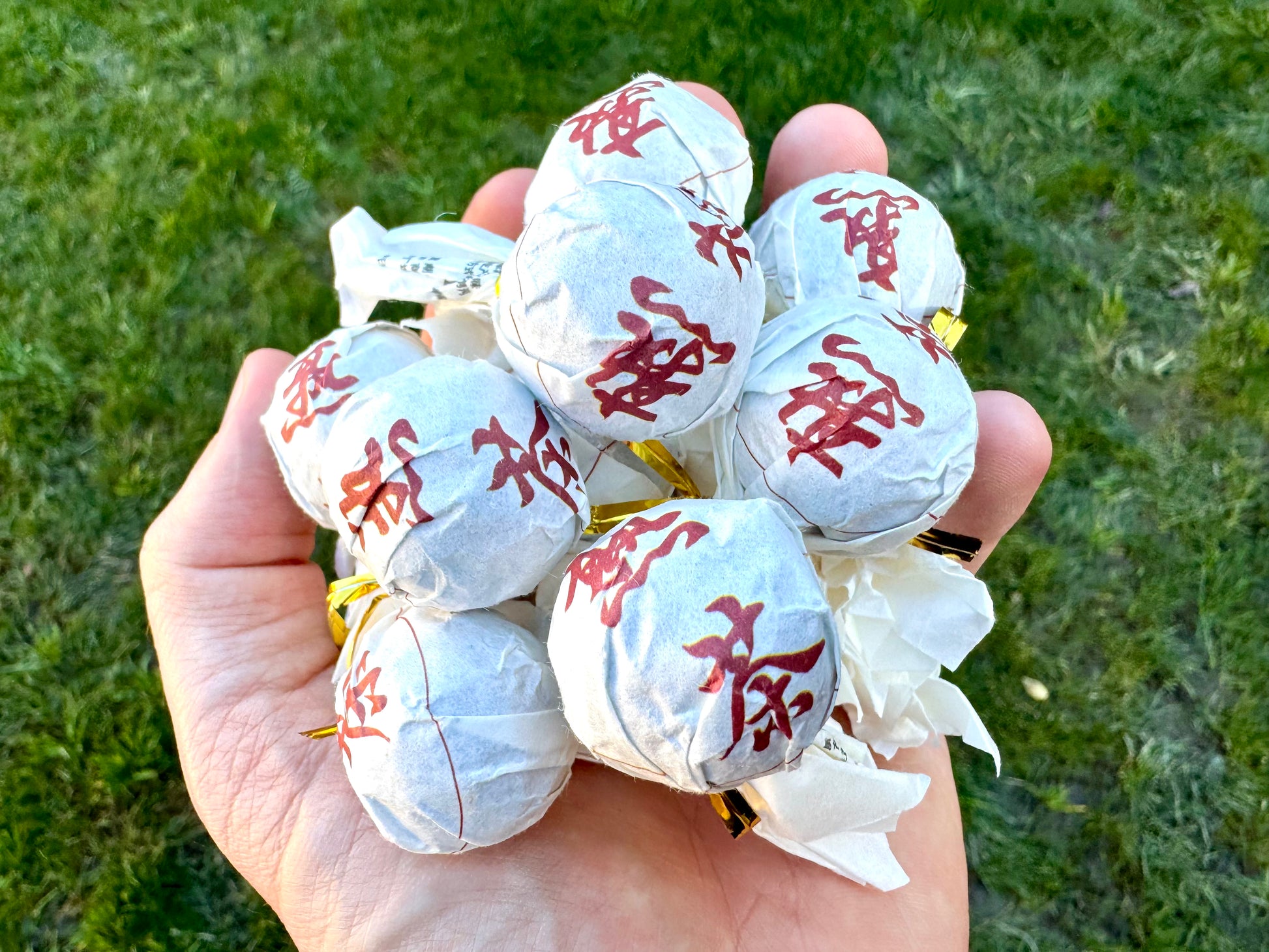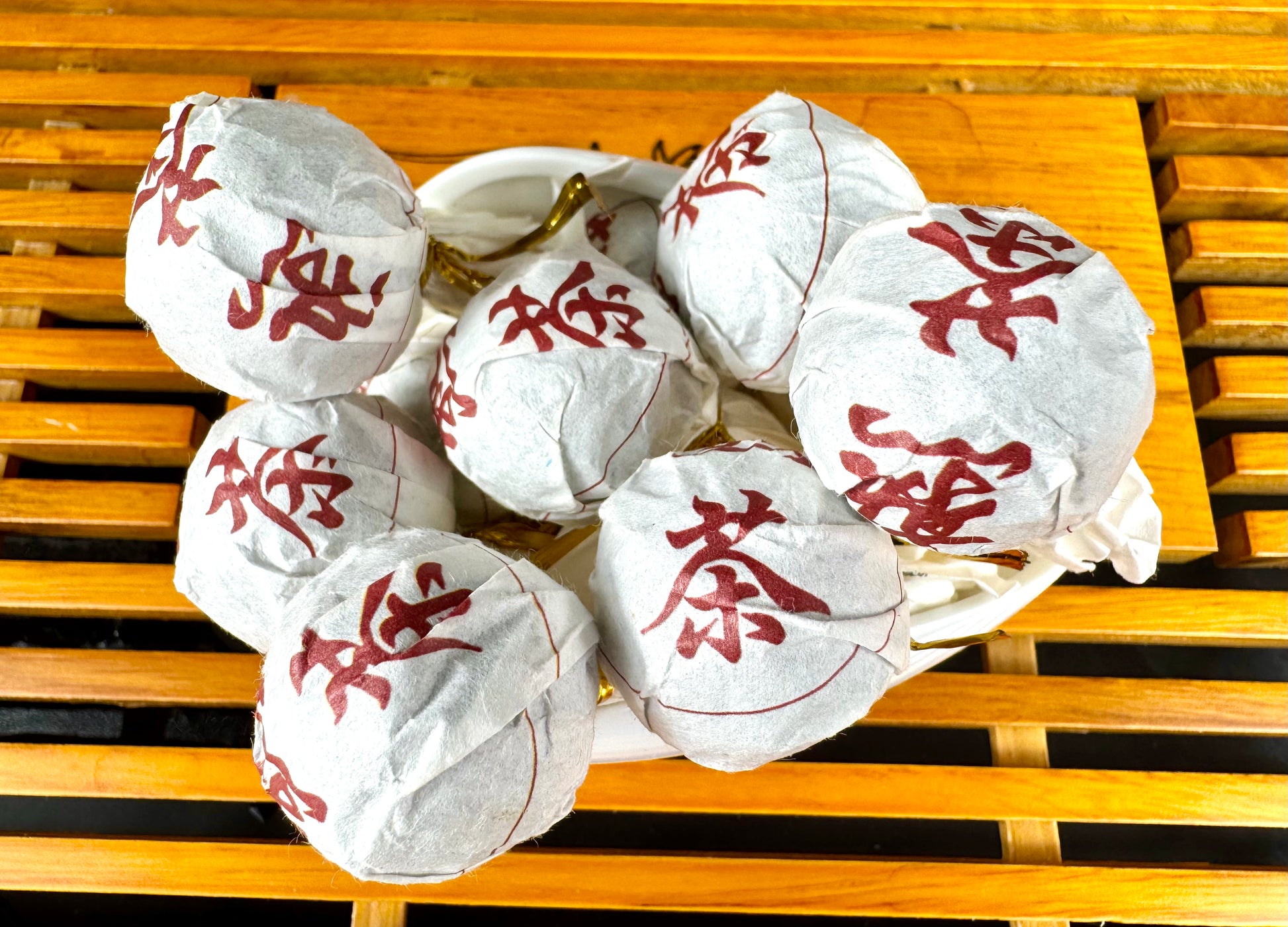 These Ripe Pu’er Dragon Pearls (熟普洱龙珠) are hand-rolled spheres of fermented Pu’er tea, produced in Yunnan and carefully aged since 2010. Each pearl is made from fermented Yunnan large-leaf tea, tightly wrapped into a compact orb that slowly unfurls over multiple steeps.